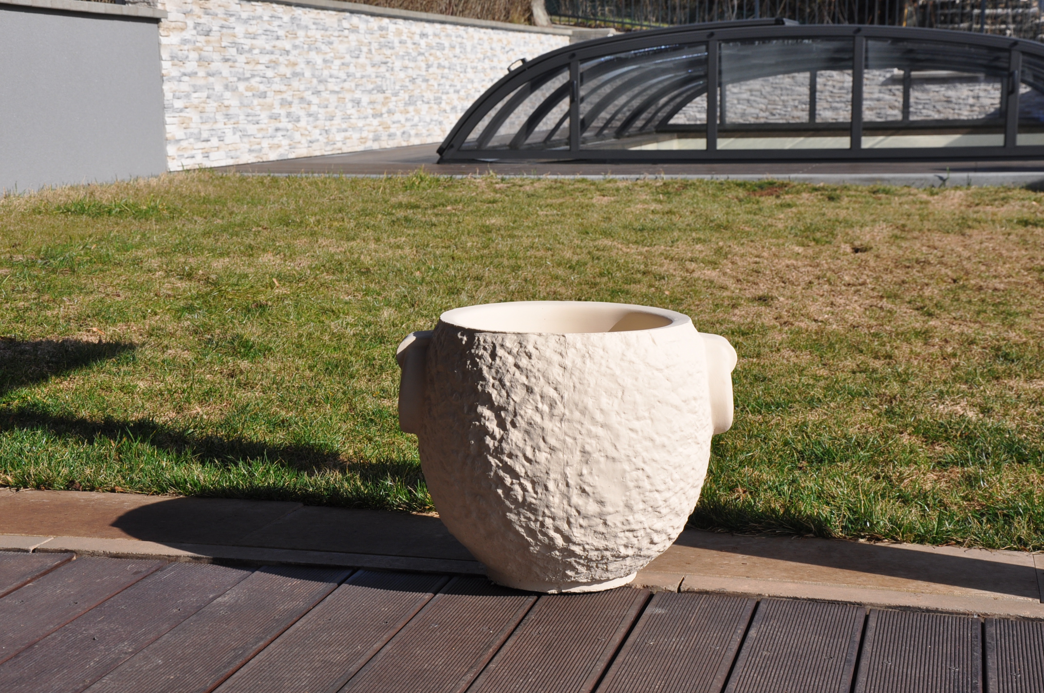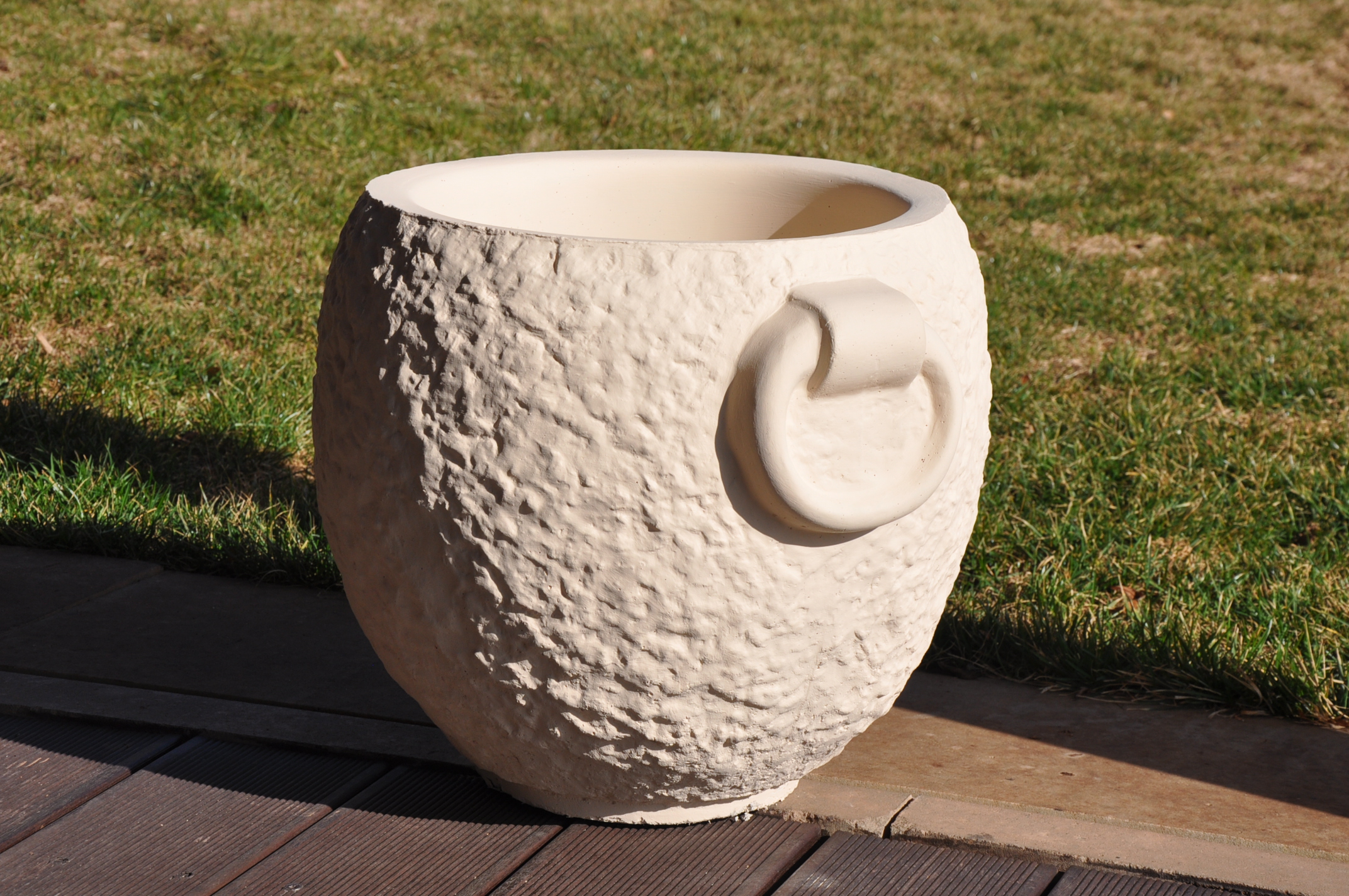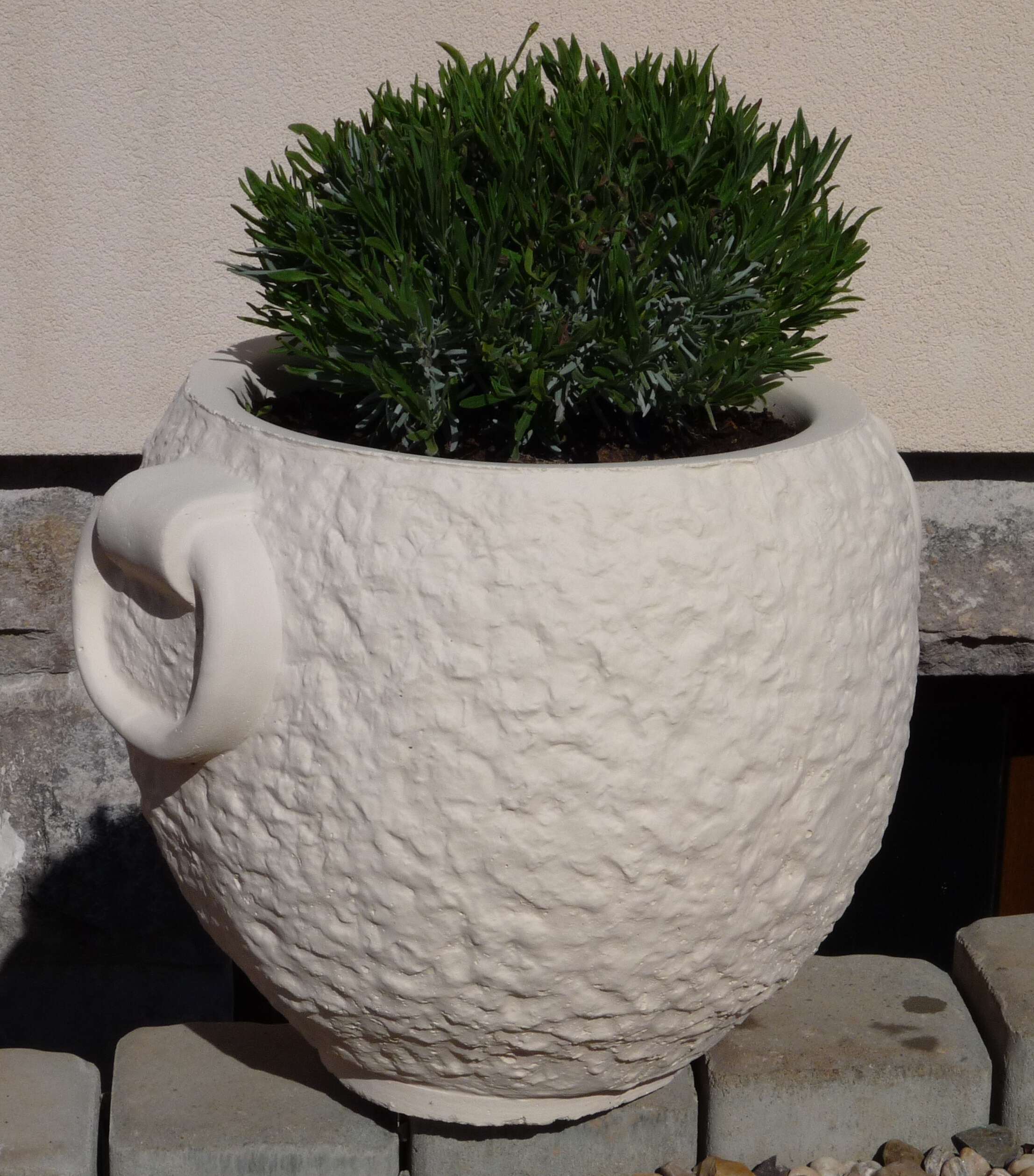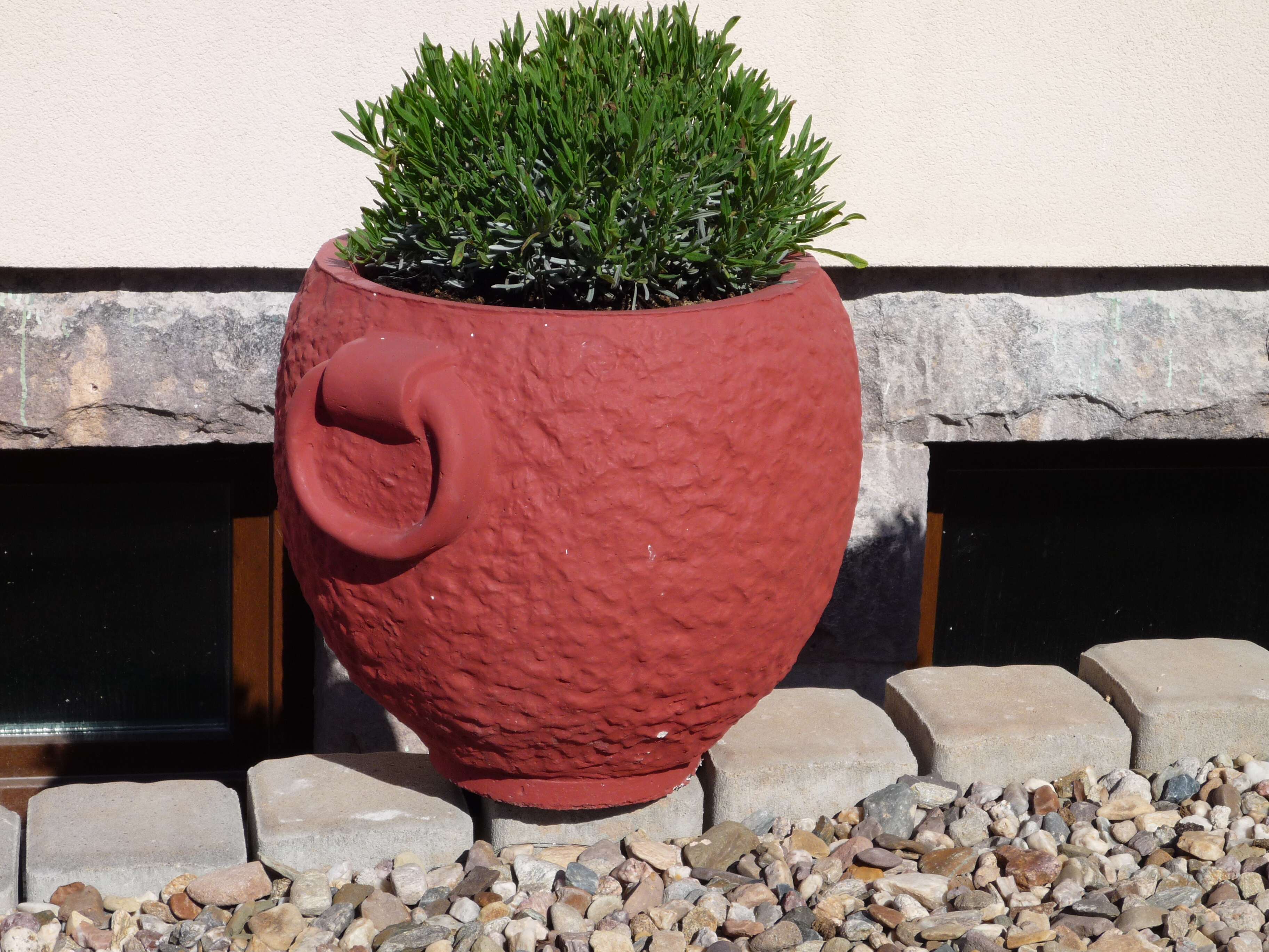 okrasný kulatý květináč natřený fasádní barvou