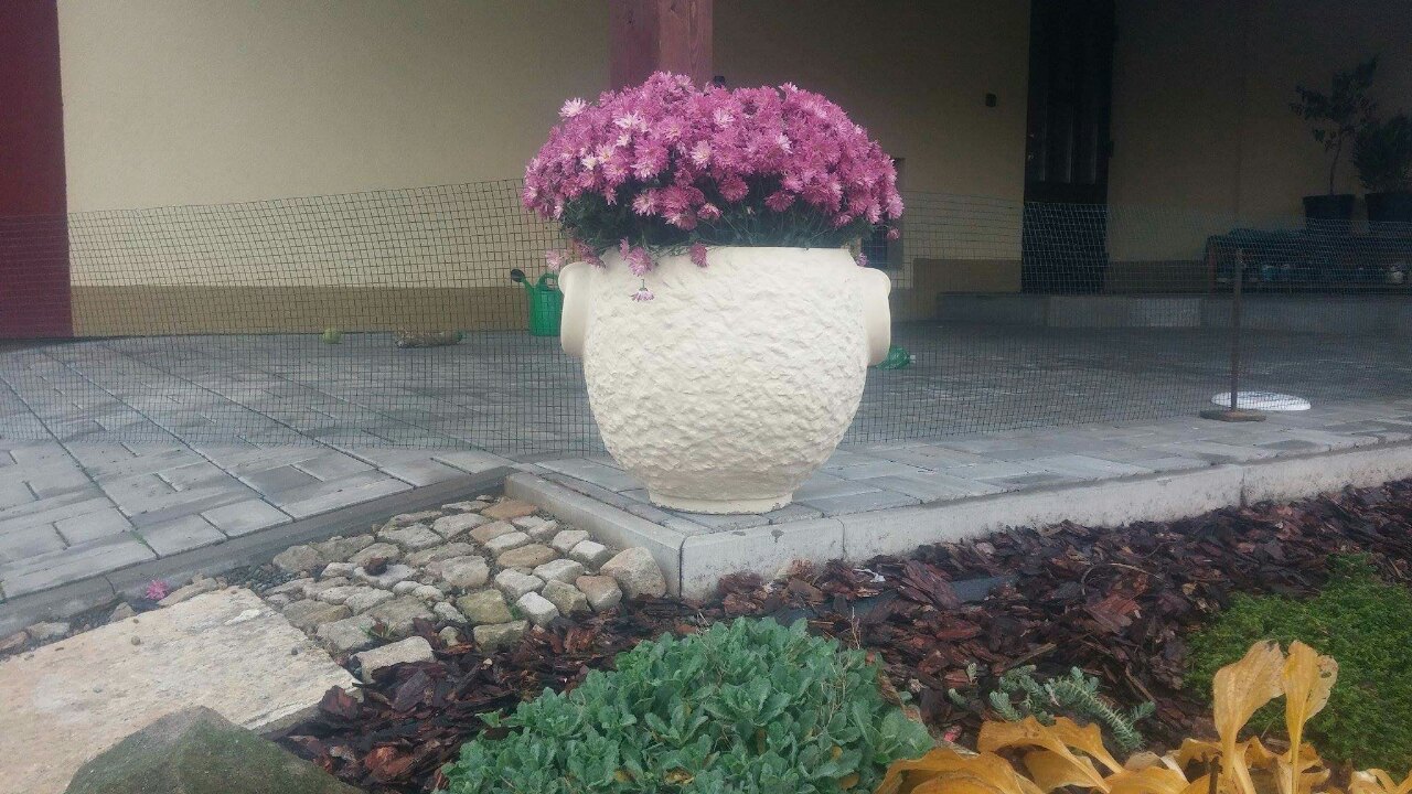 okrasný kulatý květináč natřený fasádný barvou